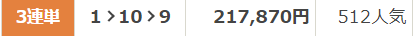 レースの結果は1>10>9で見事的中!配当は217,870円!